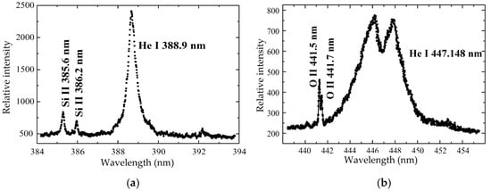 The presence of O II, Si II and Si III spectral lines in our experiments was first observed in the spectra emitted from the T-tube while using pure helium as the working gas [,]. Oxygen and silicon occur in our plasma as impurities originating from the glass walls of the discharge vessel. Two examples of these spectra are given in Figure 1.
