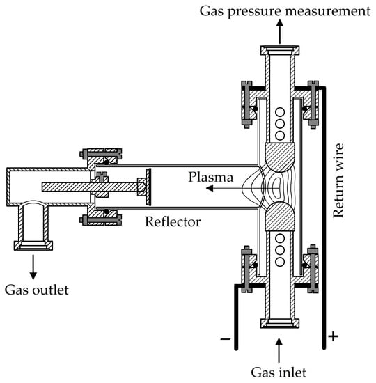 The plasma was produced in an electromagnetically driven T-tube [,]. The T-tube consists of a glass vessel with an internal radius of 27 mm with electrodes placed in the vertical part of the tube. A reflector made of quartz glass is positioned in the horizontal part of the tube, 14 mm from the electrode axis. The cross section of the T-tube is given in Figure 2.