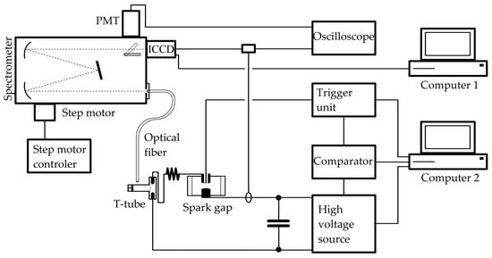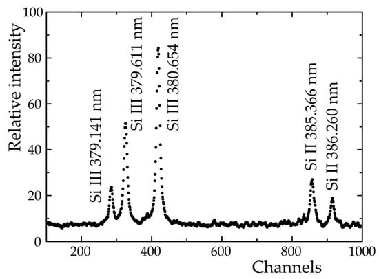 According to the observed signal, a delay time of 6.5 µs and an exposure time of 0.5 µs were chosen, in order to record radiation originating from stable plasma []. An ICCD camera was used for the recording of the spectra, see example in Figure 7.