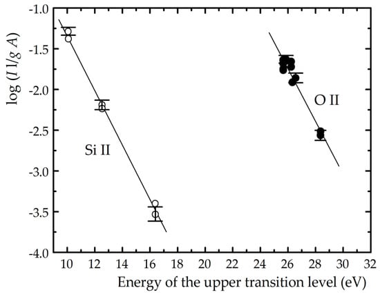 Boltzmann plots of Si II and O II spectral lines [].