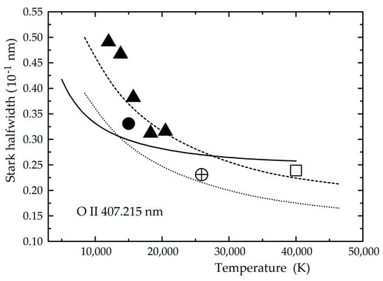 Experimental and theoretical Stark halfwidth dependence on temperature for the O II 407.215 nm spectral line for the electron density of 1023 m−3. The presented data are: ⊕ [], ⬜ [], ▲ [], ⬤ [],