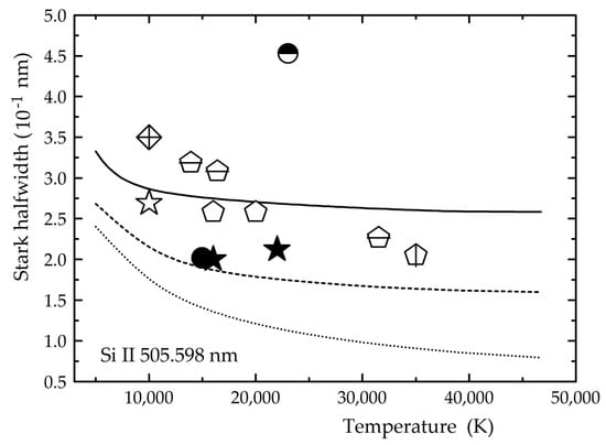 - Pérez, C.; de la Rosa, I.; Frutos, A.M.; Mar, S. Temperature dependence of Stark broadening for several Si II lines. Phys. Rev. E 1993, 47, 756–759. [Google Scholar] [CrossRef]