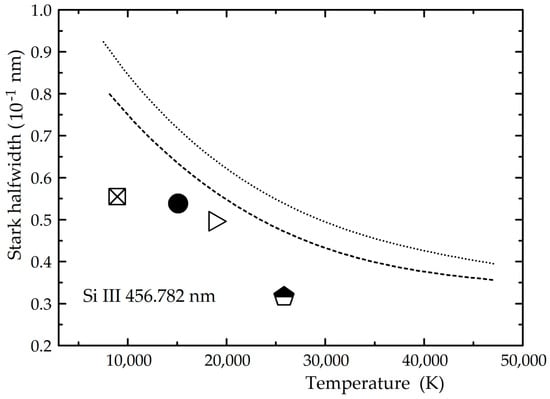 - Gavanski, L.; Belmonte, M.T.; Savić, I.; Djurović, S. Experimental Stark halfwidths of the ionized oxygen and silicon spectral lines. Mon. Not. R. Astron. Soc. 2016, 457, 4038–4050. [Google Scholar] [CrossRef]