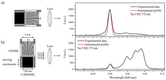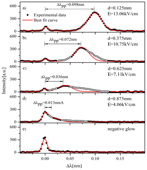 - Ivanović, N.V.; Šišović, N.M.; Spasojević, D.; Konjević, N. Measurement of the DC Stark shift for visible NeI lines and electric field distribution in the cathode sheath of an abnormal glow discharge. J. Phys. D Appl. Phys. 2017, 50, 125201. [Google Scholar] [CrossRef]