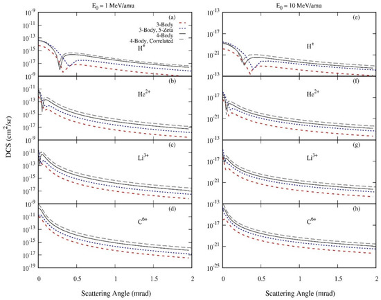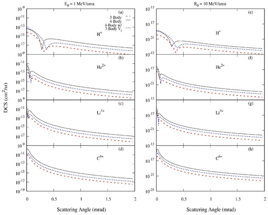 To study the effect of the inactive electron’s change of state, we perform a four-body calculation in which the final state He+ ion wave function is hydrogenic with nuclear charge 27/16 (the same as the initial state orbital). All other features of the four-body model are unaltered. Results of the three-body, four-body, and four-body with models are shown in Figure 2. For all projectiles and projectile velocities, the final state He+ ion’s nuclear charge has no discernable effect on the DCS. Closer examination of the two calculations reveals that they differ by at most 10%, with the results for being larger than those for . Thus, we conclude that the change of state of the inactive electron is not the primary cause of the differences between the three-body and four-body DCS. This is consistent with our previous work for the single ionization process, in which the change of state of the inactive electron had a negligible effect on the DCS [35,36].