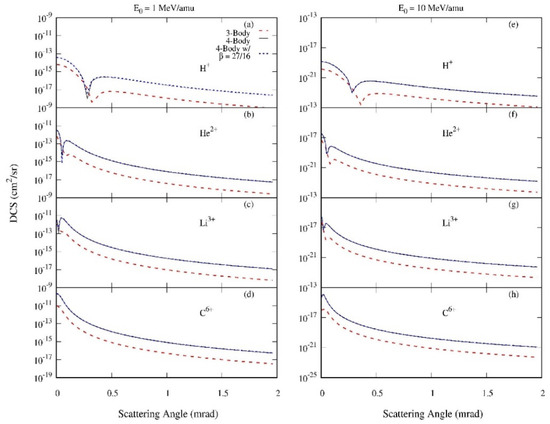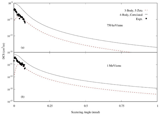 In Figure 6, results are shown for the heaviest and most highly charged projectile and agreement between the limited experimental data and the three-body and four-body models is quite poor. This may be due to the relatively large perturbation parameters of (a) and 0.8 (b), making the validity of the FBA questionable for this case. For both velocities, a downturn in the DCS is visible in the three-body model, but is not present for the four-body model. This is likely the presence of the deep minimum appearing at a larger scattering angle in the three-body model than the four-body model.