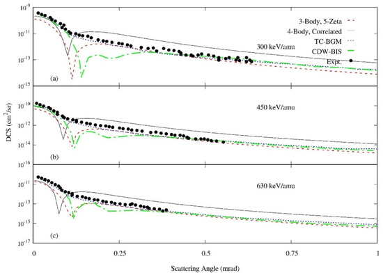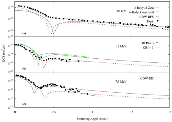In the case of 3He2+ projectiles (Figure 5), similar features are observed. However, in this case the four-body model better predicts experiment at small scattering angle, while at large scattering angles, the three-body model produces better agreement. This indicates that large angle scattering is overestimated by the use of a bare nucleus and that the nuclear–nuclear interaction in the four-body model is too strong. The non-perturbative two center-basis generator method (TC-BGM) model very accurately predicts experiment, while the perturbative Coulomb distorted wave–Born initial state (CDW-BIS) model predicts a similar deep minimum due to interference from the perturbative terms.