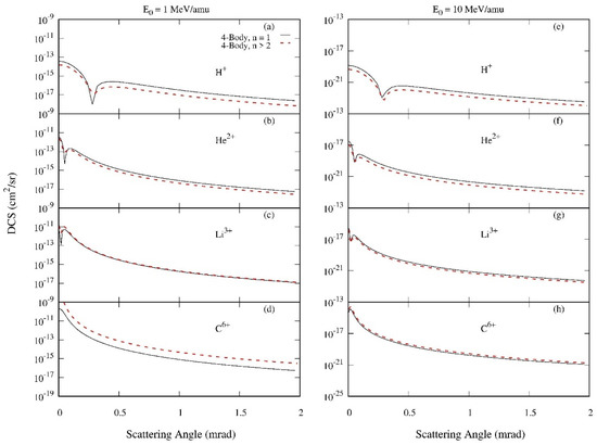Lastly, the question of relative importance of capture to the ground state compared to capture to excited states arises. As projectile charge increases, capture into excited states becomes more important. The results presented above assume that the scattered projectile electron is in the ground state and with the exception of Figure 4b,c, this is known for all of the experimental data presented. In Figure 7, we show DCS calculations with the four-body uncorrelated model for capture to the ground state compared to capture to excited states with . In all cases, the inclusion of the DCS had no discernable effect on the sum and therefore inclusion of higher excited states was unnecessary. Figure 7 shows that the likelihood of capture to excited states increases with projectile charge, as expected. With the exception of proton projectiles, capture to excited states is roughly the same order of magnitude as capture to the ground state, and needs to be included if the final bound state is not known.