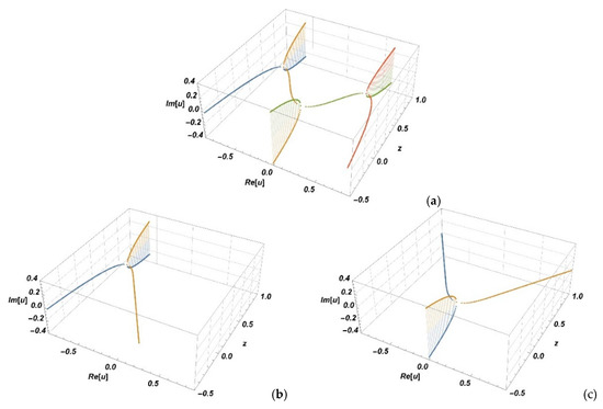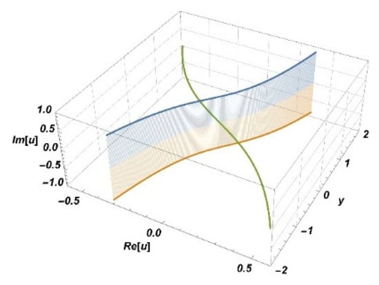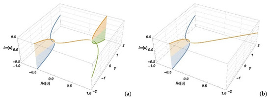 In the simplest case of two coalescing critical points (K = 1, fold catastrophe) there is a single point where , i.e., the function has an extremum and there are two stationary points and . In some range of the parameter a the stationary points are real and . For the two points coalesce and . For other values of a the stationary points are complex conjugate solutions of Equation (2), i.e., .