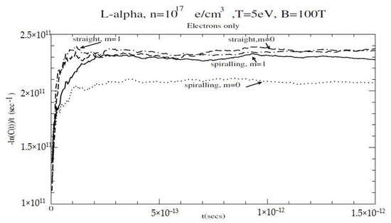 Plot of the quantity , which is seen to saturate for large t, indicating that an impact form has set in. The conditions were e/cm, T = 5 eV and B = 100 T. 10,000 configurations were used in this run. m refers to the magnetic quantum number of the spherical states, i.e., the and () components of the autocorrelation function , as the lower level is not broadened.