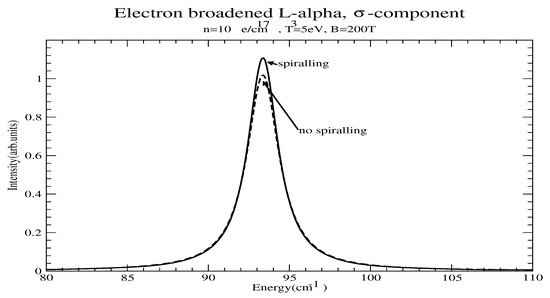 Similarly, Figure 6 shows the -component of electron-broadened for B = 200 T with no spiralling (dashed) and spiralling (solid), appropriately scaled. Again, spiralling results in a line narrowing.