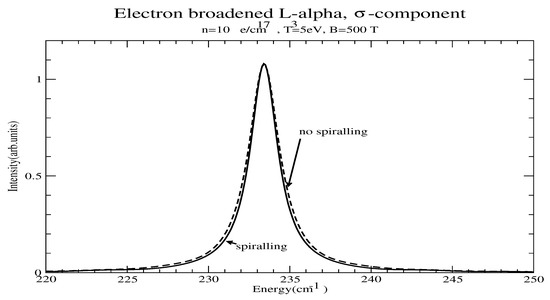 The same qualitative effect of narrowing due to spiralling is seen in Figure 7, which shows the -component of electron-broadened for B = 500 T with no spiralling (dashed) and spiralling (solid), appropriately scaled.