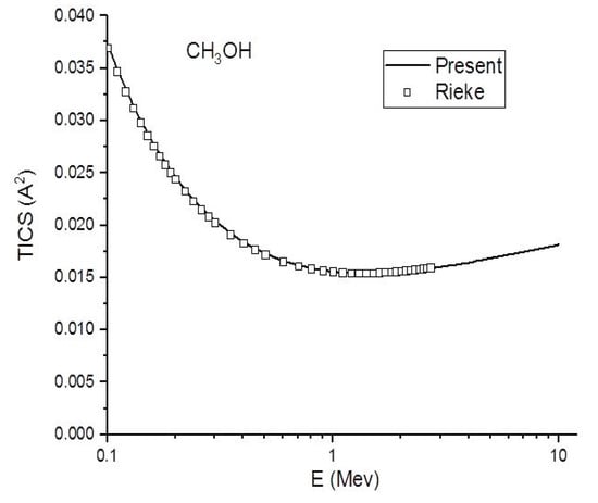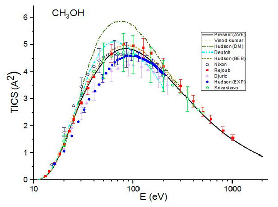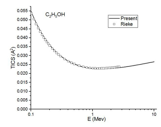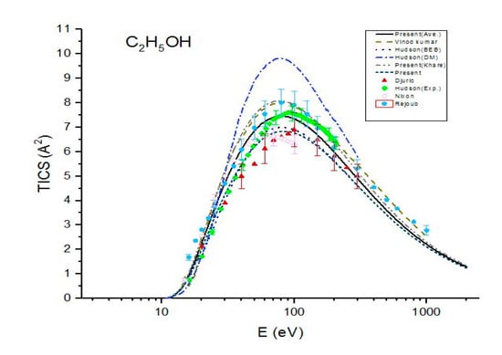 - Vinodkumar, M.; Korot, K.; Vinodkumar, P.C. Computation of the electron impact total ionization cross sections of CnH(2n+1)OH molecules from the threshold to 2 keV energy range. Int. J. Mass Spectrom. 2011, 305, 26. [Google Scholar] [CrossRef]