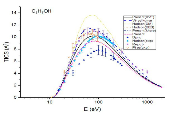In this figure, we plot the present (Ave.) total ionization cross sections (TICS) in v/s a high energy range for C3H7OH.