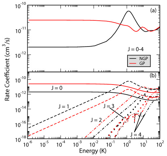 Rate coefficients for the H + H( H + p − H reaction plotted as functions of the collision energy. Panel (a) summed over the total angular momentum quantum number , and (b) contribution from different values of J. Reproduced with permission from Kendrick et al. [47].