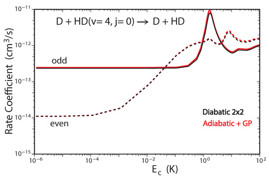 Figure 6 plots the total rate coefficient as a function of collision energy for the D + HD(, ) → D + HD reaction computed using the two-state diabatic representation (Equation (5)) [53]. For comparison, our previous GP results which were computed using the adiabatic representation with a vector potential on a single ground electronic state BO PES are also plotted in red [45,48]. The results for even (odd) exchange symmetry are plotted using solid (dashed) curves, respectively. The total energy of ultracold D + HD(, ) collisions is approximately which is well below the energy of the CI (≈2.7 . Thus, the non-adiabatic couplings to the excited electronic state are expected to be small and the results from the two-state diabatic calculation (which implicitly includes the GP) are expected to agree with the adiabatic + GP results. From Figure 6 we see that this is indeed the case, the black and red curves are essentially identical over the entire energy range (). The and shape resonances (bumps) near and , respectively, are also well reproduced by both sets of calculations. However, for total energies which lie above the energy of the CI, we expect that the couplings with the excited electronic state will become important and the two-state diabatic results will be different than the adiabatic + GP results. The high energy regime was recently investigated for the H + H reaction with high vibrational excitation of H() [54]. For the ultracold H + H(, ) collisions, the total energy is approximately which is significantly above the energy of the CI. Figure 7 plots the total rate coefficient as a function of collision energy for the H + H(, ) → H + p − H reaction computed using the two-state diabatic representation (in black), the adiabatic with GP (in red), and the adiabatic without GP (in blue). The diabatic and adiabatic + GP are in good agreement at ultracold collision energies and for energies above . However, for intermediate energies near the shape resonance at , we see significant differences between the diabatic and adiabatic + GP results. As expected, the adiabatic (NGP) rate coefficient is significantly different from both the diabatic and adiabatic + GP results: it is suppressed by a factor of three at ultracold collision energies, and the shape resonance near is enhanced while the shape resonance near is suppressed. Figure 7 confirms that a coupled two-state diabatic calculation is required for total energies which lie significantly above the energy of the CI and that both GP and other non-adiabatic effects are important.