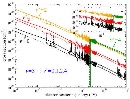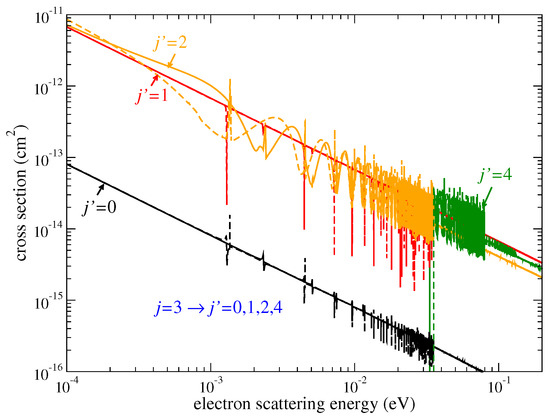 where is the reduced mass of the electron-ion system. Figure 1 demonstrates, as examples, the cross sections of Equation (3) for the transitions of HeH (solid lines) and HeD (dashed lines). At very low scattering energies, below 0.001 eV, the de-excitation cross sections behave as according to the Wigner threshold law [31]. At higher energies, all the (de-)excitation cross sections vary significantly due to the presence of series of Rydberg resonances.