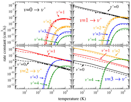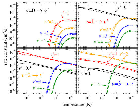 Figure 2 and Figure 3 show thermally averaged rate coefficients (see Equation (13) of paper I) computed for transitions between the lowest vibrational levels for the four HeH isotopologues. The uncertainty of the rate coefficients for all transitions is about 5–30% for different temperatures. Due to the general dependence of the cross sections, the calculated rate coefficients behave as as functions of temperature T for de-excitation and as for excitation transitions, where is the excitation energy. Therefore, similarly to papers I and II, for convenience of use, the rate coefficients are fitted to the formula