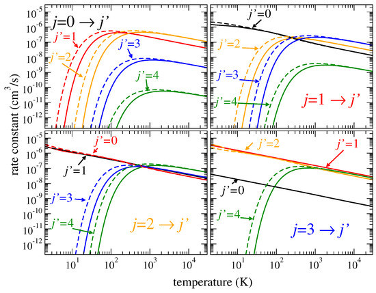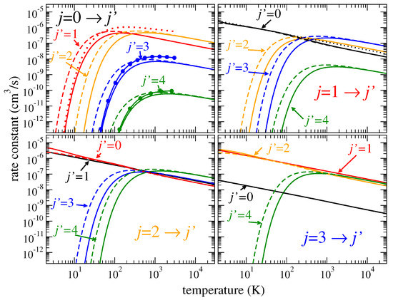 In addition, the rotational rate coefficients behave approximately according to Equation (4), where should be replaced with the rotational threshold energy, , and a quadratic polynomial is used in the fit. The probabilities for the direct () and the inverse () processes are related to each other by the relative degeneracy factor