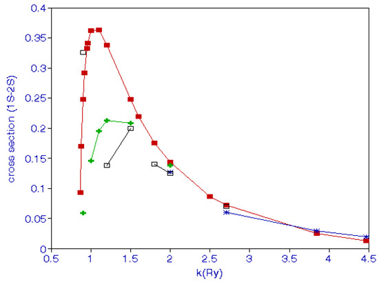 (Color online) Total 1S−2S excitation Cross Sections () versus the incident momentum k (Ry). The green plus points represent the results of Burke et al. [1], the blue stars represent the results of Walters [3], and the black squares represent the results of Kernoghan et al. [4].