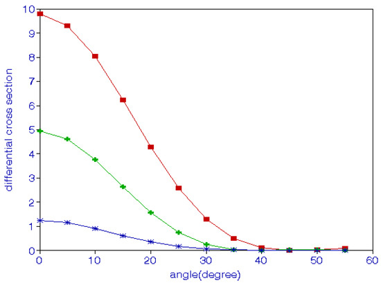 (Color online) Differential cross-sections versus angle (°) at k = 2.5 (upper curve), 3.834 (middle curve), and 4.696 (lower curve).