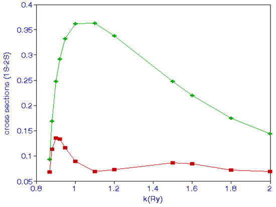 Calculation of cross-sections for excitation of the 2S state of atomic hydrogen at low incident energies requires that coupled equations be solved. The close-coupling method has been applied by Burke et al. [1] in which the total wave function is expanded in eigenstates of the hydrogen atom to calculate the positron-impact excitation cross-sections of the 1S state to the 2S state of the atomic hydrogen. Their results are given in Table 1. The same method has been applied to calculate positron-impact excitation by Morgan [2]. The wave function has both 1S and 2S states, and therefore is equivalent to solving coupled equations. She used three-state and twelve-state bases obtaining 2.08(−1) and 2.61(−1) , respectively, for the excitation cross-section at k = 1.5. The present calculation gives 2.48(−1) at k = 1.5, which is in good agreement with the cross section obtained by Morgan [2]. A close-coupled pseudostate approximation used by Walters [3] to calculate 1S to 2S and 2P excitation cross sections at four incident energies. His results are 1.27(−1), 6.1(−2), 3.0(−2), and 2.0(−2) at 54.4, 100, 200, and 300 eV incident energies, respectively. His results are compared with the present results, given in Table 1. Calculations carried out by Kernoghan et al. [4], using a 33-state approximation between 0 and 110 eV incident energies. They used 1s, 2s, and 2p eigenstates of both positronium and hydrogen atoms, together with 27 hydrogen pseudostates, to calculate elastic scattering cross sections, H(2s) and H(2p) excitation cross sections. Their results are given in figures rather than in a numerical form, making it difficult to compare their results with the present results. However, some results have been extracted from their figure and are also given in Table 1. Calculations carried out by Das et al. [5] by applying a distorted wave theory that takes into account a polarization potential with a variable cutoff parameter and Lorentzian astrophysical plasma, for incident positron energies of 54.4, 100, and 200 eV, obtaining cross-sections of 1(−1), 5(−2), and 2(−2) , respectively, for 1S to 2S excitation. The calculations from this research gave 1.44(−1), 7.21(−2), 2.60(−2), and 1.28(−2) at k = 2.0 (54.4 eV), 2.711 (100 eV), 3.843 (200 eV), and 4.696 (300 eV), respectively, which are fairly close to their results [5]. A close-coupling calculation has been carried out by Sarkar and Ghosh [6] with two basis sets of hydrogen and positronium atoms. Calculations of excitation cross sections in the close-coupling approximation by Mitroy et al. [7] have been carried out using six hydrogenic and six positronium states. Their results are shown in Figure 8 of Reference [7]. They find excitation cross-sections increase in a linear manner as the incident energy is increased from the threshold to 1 Ry. Calculations have been carried out by Ratnavelu et al. [8] to obtain total cross-sections: elastic scattering, positronium formation, and ionization cross sections. Total cross-sections must include excitation to higher levels. However, they do not give any results for excitation cross-sections and estimating cross-sections for the 2S state only is unlikely. Moreover, their cross-sections have a 30% uncertainty. The present results are given in Table 1 and are compared with results obtained in References [1,2,3,4,5,6] wherever available.