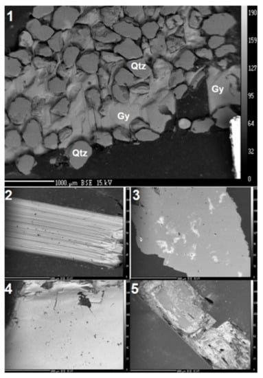 Electron microscope (SEM) images of the samples used in the present study which include: 1: Desert Rose Gypsum, Sahara Desert, Morocco (MDRG), Gypsum, Gy, and quartz, Qtz, are identified. 2: Acicular Gypsum, Morocco (MAG). 3: Gypsum, Kachchh, Gujarat, India (KG). 4: Gypsum, Rajpura-Dariba Cu-Pb-Zn Mine, Rajasthan, India (RDG1). 5: Gypsum, Rajpura-Dariba Cu-Pb-Zn Mine, Rajasthan, India (RDG2).