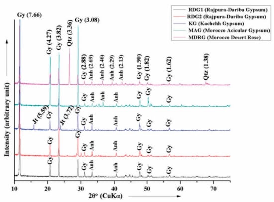 X-ray diffraction studies on powered samples reveal the presence of gypsum and anhydrite in all samples, as illustrated in Figure 3, having a prominent d-spacing of 7.66 Å, 4.27 Å, 3.82 Å, 3.08 Å, and 2.69 Å 1.82 Å, respectively. The presence of Jarosite (d-values: 5.59 Å and 3.72 Å) is noticed in gypsum from Matanumadh, Kachchh, whereas in Desert Rose gypsum (Morocco) sample, quartz is observed with characteristic d-values of 3.36 Å (I/I0: 59.42) and 1.38 Å (I/I0: 5.59).