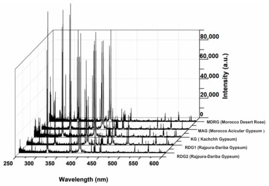 Typical laser-induced breakdown spectroscopy (LIBS) spectra (250–600 nm) of different gypsum samples analyzed during the present study stacked to show the relative intensity variations amongst the samples.