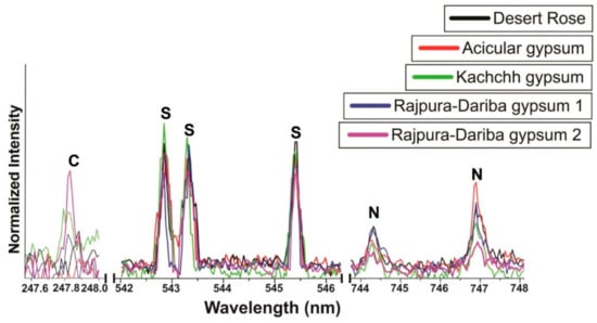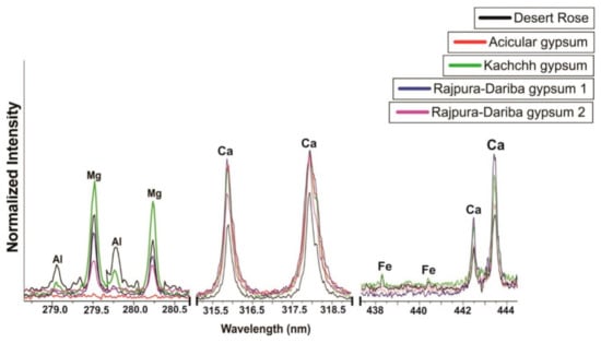 The differentiation of LIBS spectra of similar types of samples is difficult by visual inspection, but careful analysis of the spectra reveals differences in the intensity of the gypsum samples because of their variable elemental concentrations. The wavelengths of different spectral lines that were present in the LIBS spectra of all five gypsum samples have been identified while using the NIST atomic spectroscopic database []. Figure 5, Figure 6, Figure 7 and Figure 8 display details of the spectra, together with the identified elements.