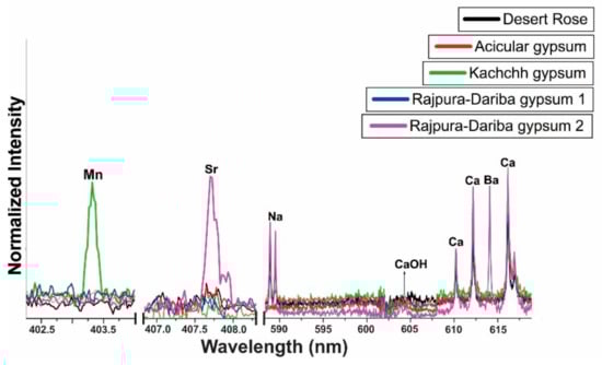 If the concentration of any element in the sample is very high, its molecular bands must be present in the laser induced plasma of the sample []. The presence of sulfur lines (542.8 nm, 543.2 nm, 545.3 nm) in the LIBS spectra of gypsum also confirms its presence, as indicated in Figure 8. Similarly, the presence of carbon line at 247.8 nm and oxygen at 777.1 nm indicates the presence of carbonates in the present study. Strong spectral lines of magnesium at the wavelengths 279.5 nm, 285.2 nm, 383.8 nm, etc. are present in four gypsum samples, except in the acicular sample (MAG). Magnesium occurs in the defect sites of the gypsum lattice, since they form large soluble complexes []. The intensity of the spectral line of magnesium varies, depending upon its concentration in the sample. The presence of prominent line of Si in MDRG is due to the presence of quartz grains from the sand, which bonds with moisture on the top of gypsum plates. The Ca lines are prominent in all gypsum samples, except MDRG, as quartz grains dominantly mask the analyzed spots. The presence of spectral lines of Fe in KG and MDRG are due to jarosite and quartz, respectively. Gypsum comprises abundant fluid phase, which is a mixture of various elements K, Ti, Mn, and Sr in minor to trace amounts. Their concentration in gypsum is used in stratigraphic correlation, paleosalinity estimation, and to decipher the origin of brine and diagenesis [,]. The presence of spectral lines of Mn and Fe in KG indicates that the terrigenic source deposits mainly siliciclastic sediments or clay minerals into the sedimentary basin. Sr lines are found in RDG2, as Sr can replace Ca in the gypsum lattice []. The presence of strontium in gypsum can take place in many ways, like digenetic process, bacterial sulphate reduction, or by dissolution or recrystallization. The abundance and scarcity of Sr content in gypsum indicate the episodic salinity fluctuation of the basin, and this also reveals the paleohydrology of the basin []. Similarly, the presence of spectral line of Ba (455.4 nm and 614.1 nm) may be correlated as a possible tracer of fluid circulation in hydrothermal water []. Table 1 and Table 2 sumarize the wavelengths of the spectral lines that were observed in the LIBS spectra of all five gypsums. The same calcium lines are identified in all the samples and the wavelengths are listed below in Table 2.