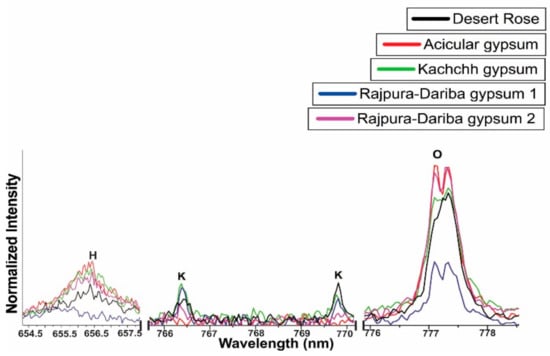 The hydration level in gypsum depends upon the hydrogen and oxygen content; calcium sulfate either occurs as non-hydrated (anhydrite CaSO4) or hydrated phase (bassinite CaSO4·½H2O and gypsum: CaSO4·2H2O). The H alpha emission line at 656.5 nm is sensitive to hydrogen content, which can can differentiate the hydration levels of calcium sulfates in the samples. Similarly, the emission line of oxygen at 777.1 nm is sensitive to correlate the hydration level in the sample []. The spectral lines of both elements are detected, but the respective intensities of the spectral lines of hydrogen and oxygen in samples RDG-1 are very low. Thus, their concentration in RDG1 is also low, which establishes that the calcium sulfates observed may be bassanite.