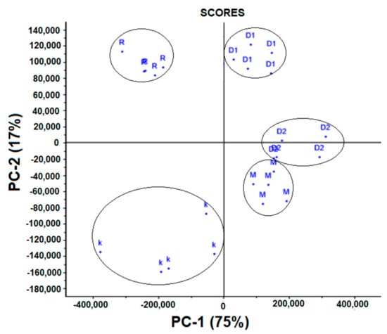 Principal component analysis (PCA) plot of the samples. The labels indicate the gypsum K = Kachchch; M = Acicular; D1 = Rajpura-Dariba 1; D2 = Rajpura Dariba 2; R = Desert Rose.