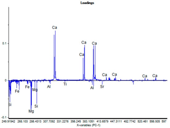 PCA is used to analyze the LIBS spectra of the gypsum samples in the present study. The spectra that were obtained from different gypsum samples are arranged in the form of matrix, which is made up with variables having 8848 features. The Unscrambler-X software (CAMO Software, Banglore, India) is used to solve the data matrix to generate PCA plot. Figure 9 illustrates that the combination of PC1 and PC2 is 92%, which is very close to 100%, which explains most of the variance that is present in the dataset. Five replicate spectra of each gypsum sample are classified in five different groups while using PCA. These groups indicate variation in elemental concentrations in gypsums. Replicates of each gypsum sample are very close to each other, forming a clustering in the score plot. Clearly, the samples of each class tend to cluster and they are well-separated from the other classes in almost all cases. The PC1 classifies gypsum samples into two groups (see Figure 9). The first group contains MAG, RDG1, and RDG2 having positive correlation. The second groups KG and MRD show negative correlation. MRD and KG are different from MAG, RDG1, and RDG2, as they contain Si, Fe, Al, Mg, and Ti. The above observation is also consistent with the loading plot, as illustrated in Figure 10. A positive correlation that was observed in the loading plot corresponds to the emission lines of Ca, which is greater in RDG1, RDG2, and MAG, while a negative correlation is noted in Si, Al, Ti, Mg, and Fe. In the second group (MRD and KG), Fe and Mn are only present in KG. The Si content is very high in MRD in comparison to KG. This is the main reason that leads to the classification of these samples into two different clusters based on PC2. Further, the cluster of KG is comparatively spread out, which suggests sample heterogeneity. Similarly, PC2 is classified into two different categories in the first group (RDG1and MAG) due to the less hydration in RGD1. The clustering of RGD2 and MAG are very close to each other, as they contain meager impurities. However, RGD2 and MAG also form two groups because of Sr and Ba that are present in RDG2.