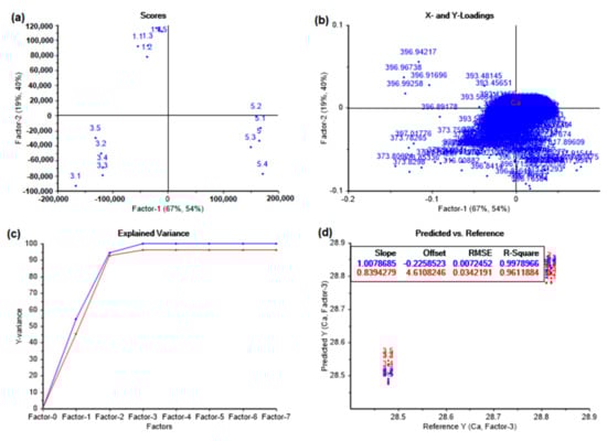 (a) Score plot of Partial Least-Square Regression (PLSR) model, (b) Loading plot of PLSR model, (c) Explained variance plot in PLSR model, and (d) Predicted vs. Reference.
