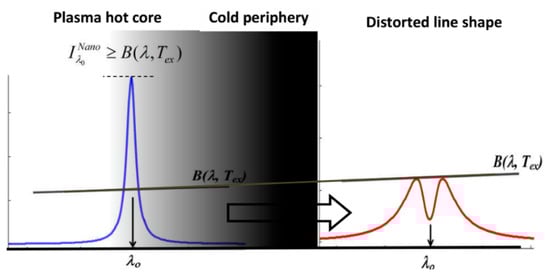 There are significant challenges when considering self-reversed lines, especially for resonance lines, for the evaluation of the electron density measured from the full-width-at-half-maximum, and the determination of the temperature that is a function of the spectral radiance. Moreover, spectral line intensities from nano-based materials show differences from the corresponding bulk signals [12]. The theoretical descriptions of self-absorption and self-reversal [5,6,7,8,9,10,11] rely on the computation of the emitted radiation when modeling the emitters by a specific distribution.