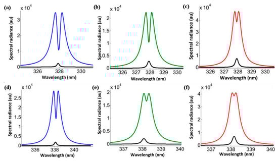 Line shapes (a) self-reversed ΔλS2 = 0.37 nm, SR = 0.3, T(λ) = 33%; (b) Self-absorbed ΔλS1 = 0.2 nm, ne1 = 4.2 × 1018 cm−3, SA = 0.01; (c) Reconstructed 327.9-nm optically thin line: ΔλS0 = 0.017 nm, ne1 = 3.5 × 1017 cm−3, SA = 1. (d) ΔλS2 = 0.32 nm, SR = 0.38, T(λ) = 40%, (e) ΔλS1 = 0.19 nm, SA = 0.01, and (f) 338.2-nm line: ΔλS0 = 0.017 nm, ne1 = 3.5 × 1017 cm−3, SA = 1. Light pulses for (a,d) of fluence 13.5 J/cm2 at 355 nm generated laser plasma. Reconstruction for (c,f) is accomplished with data from the 827-nm line.