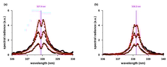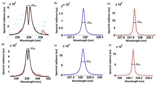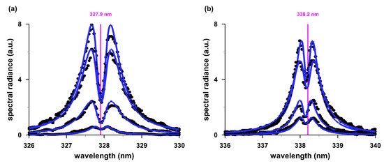 The theoretical transmittances are compatible with SR factors of 0.32 and 0.38. The measured line shapes are well-described by the fitted Lorentzians. However, for sake of simplicity, this discussion omits Gaussian components due to instrumental broadening of Δλinstrument ~0.12 nm. Figure 8a,d show a significant reduction in intensity along with an apparent increase in broadening (ΔλS2). The self-reversal coefficients are relatively small (SR = 0.32 and SR = 0.38), but due to line center effects [2,5,6,7,8,9,10] dips occur. Noteworthy in this work, self-reversal (quantified by the coefficient SR) is almost independent of the laser fluence, but self-absorption (SA) changes monotonically with laser fluence.