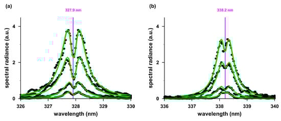 The experimental evaluation included change of the incident laser fluence in the range from 5 to 10 J/cm2 and measurement of the emission spectra during IR laser irradiation. The lines are Voigt-fitted to recorded spectral radiances as indicated by the solid black lines in Figure 6. The Stark broadening parameters for both lines are archived in Stark tables [15]: At the reference electron density of Neref = 1017 cm−3, the Stark broadening parameter, ωSAgI, amounts to ωSAgI = 0.18 ± 0.06 nm. The Lorentzian components of the emitted lines, λSAgI, were extracted. The electron densities listed in Table 1 were evaluated with the help of the expression, neAgI ≈ Neref (λSAgI/ωSAgI), and then compared with the corresponding values obtained from Hα.