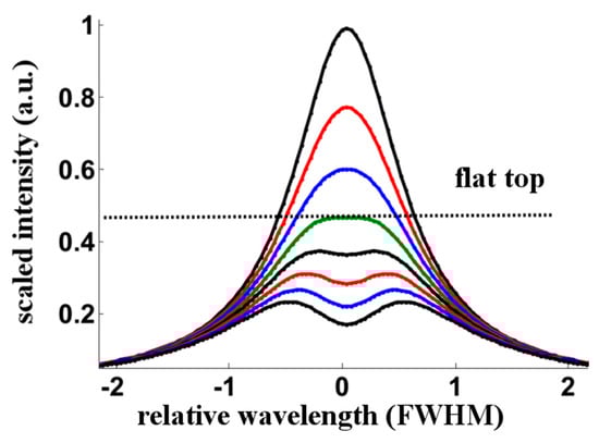 is defined in terms of integrated absorption coefficient, κ (λ), of a spectral line measured along the line-of-sight, ℓ, at the transition wavelength, λ0. Figure 7 illustrates results for ranging from 0.25 to 2 at equal steps of 0.25, and for fixed Lorentzian FWHM of Δλs = 0.5 nm. The line shape indicates a flat top for unity optical thickness, i.e., . For values higher than unity, self-absorption affects the line shape primarily at the center [2].