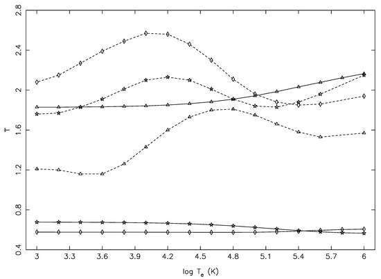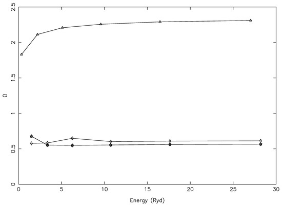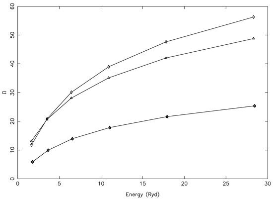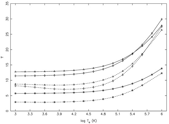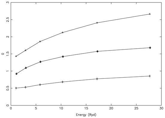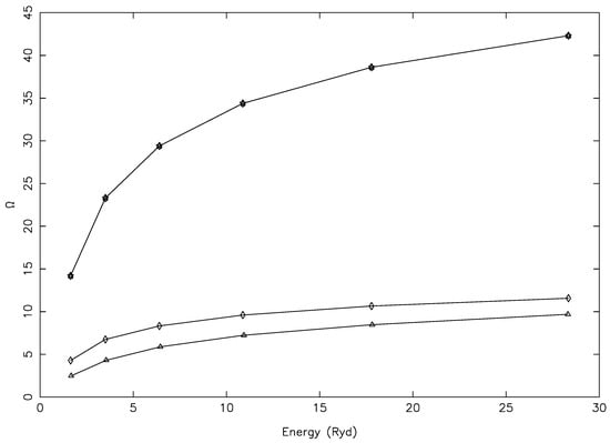 For some other transitions with larger magnitudes, we note a different kind of problem, shown in Figure 12 for three, namely 14–198 (3s3p3d F–3s3p(P)3d D), 19–198 (3s3p3d P–3s3p(P)3d D), and 25–198 (3p3d D–3s3p(P)3d D), all of which were allowed. For these (and several more) transitions, the values of were rising too steeply, i.e., by over a factor of 50 between 10 and 10 K, a short span of 6.3 Ryd. Such a steep rise in values was (generally) neither noted nor expected, as may also be confirmed from Figure 3 and Figure 4, beside others. This was yet another indication of their values not being converged, particularly at the lower end of the energy range. In fact, there were several transitions for which the values of increased between the lowest and the highest T by up to three orders of magnitude, and examples include 10–141 (3s3p(P) P–3p P), 11–137 (3s3p(P) P–3s3p(P)4p D), 18–137 (3s3p(S) S–3s3p(P)4p D), 159–198 (3s3p(D)4p D–3s3p(P)3d D), and 160–198 (3s3p(D)3d D–3s3p(P)3d D). Among these, only 10–141 was allowed, and the rest were forbidden; in particular, for the last two, there should be no resonances to contribute, and therefore, there was no convincing reason to see such a high rise in the values of .