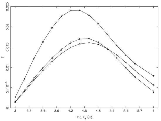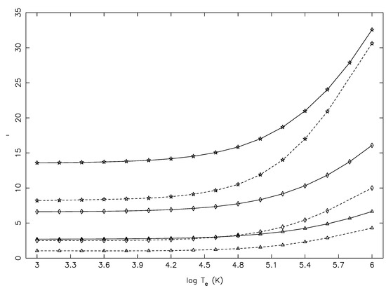 Finally, in Figure 9 and Figure 10, we show similar results of and , respectively, for three other transitions, which are allowed, have comparatively smaller f-values, do not differ as largely as for the transitions of Figure 5 and Figure 6, but have comparable E (within 10%), as listed in Table 1. Unfortunately, for these transitions also, the values of Tayal et al. [1] were underestimated at (almost) all temperatures, and this was in spite of their f-value being larger for the 20–33 transition by a factor of two! Therefore, it is clear from the comparisons of shown for 18 representative transitions (including both allowed and forbidden types) that the reported results of Tayal et al. were underestimated, particularly for the (strong) allowed transitions.
