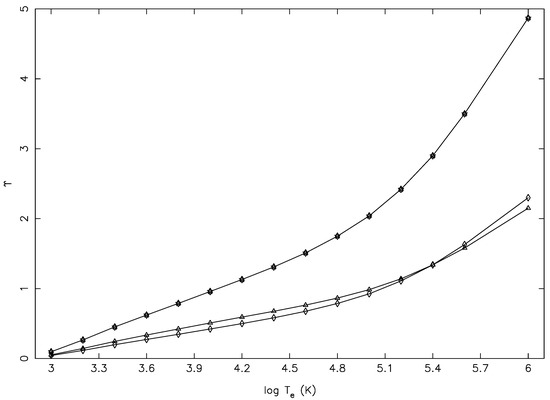 Before we conclude, we would like to note that apart from the underestimation of by Tayal et al. [1] for several transitions of S III, the behaviour of this parameter was not correct for some transitions involving the higher levels. As an example, in Figure 11, we show the variation of their with T for three transitions, which had comparatively small magnitudes, namely 1–198 (3p P–3s3p(P)3d D), 6–198 (3s3p(S) S–3s3p(P)3d D), and 24–198 (3s3p4s P–3s3p(P)3d D). The first one was parity forbidden, whereas the other two were allowed transitions. For any (type of) transition involving the highest level, there should be no resonances, or equivalently, the values of and hence should vary smoothly, decreasing or increasing, depending on the transition. However, as seen in this figure, there were clear “humps”, which indicated the presence of pseudo resonances. In a calculation with non-orthogonal orbitals, as performed by Tayal et al. there should be no pseudo resonances, and this was also reaffirmed by them. This is the same problem as noted earlier (Aggarwal and Keenan [9]) in their work on Mg V; see also Figure 7 of [7]. However, in a later paper, Wang et al. [14] argued that this behaviour happened due to a “coarse” energy mesh adopted at energies beyond thresholds, which was 0.2 Ryd in the present case; also note the contrast between 0.0001 Ryd in the threshold region and 0.2 Ryd above it. This coarse energy mesh was the cause of the incorrect behaviour seen in the figure. It needs to be finer. We would also like to note that such incorrect behaviours are not confined to the highest level alone, but to others as well; see, for example, the 12–195/196/197 transitions. Transitions among the higher lying levels may or may not affect the modelling or diagnostics of plasmas, but the incorrect behaviour of for these certainly undermines the confidence in their calculations.