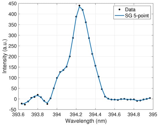 Ce II 394.3-nm emission peak after effective smoothing and noise reduction by a five-point Savitzky–Golay (SG) filter.