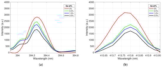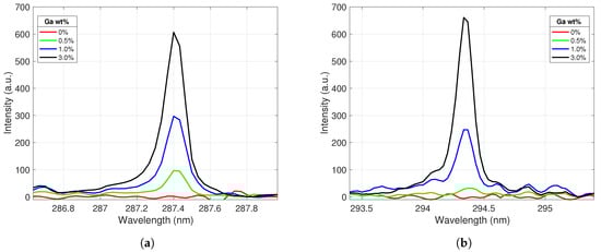 Four emission lines (Ga I 287.4 nm, Ga I 294.4 nm, Ce II 394.3 nm, and Ce II 413.8 nm) were identified for use in building calibration curves. These lines appeared across all gallium concentrations tested and were relatively free from other spectral interferences. These lines were extracted from each spectrum and processed according to the routine described in Section 3. Figure 3 displays the behavior of the two selected gallium emission lines with varying gallium concentration levels in the alloy sample. The peak intensity increased as the weight percent of gallium in the alloy increased, as expected. These lines showed good responsiveness to gallium concentrations, and their line shapes suggested that the plasma was optically thin and free from self-absorption for these emissions.