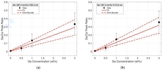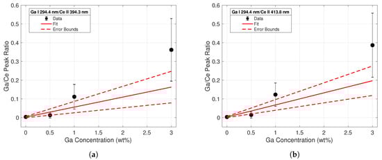 Calibration curve from line intensity ratios of the Ga I 287.4-nm emission to the (a) Ce II 394.3 nm (b) and the Ce II 413.8-nm emission lines. The regression fit is shown with a solid red line, while errors in the regression coefficients are plotted with the dashed red lines.