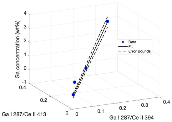 Multivariate analysis is commonly used in the analysis of complex spectra [28,29,30]. This technique numerically estimates how multiple independent input variables interact to produce the dependent response; this can result in a fit with less statistical uncertainty than a univariate calibration [31]. In this case, the intensity ratios of the Ga I 287.4-nm line to the Ce II 394.3-nm and 413.8-nm lines were analyzed using the multivariate regression function in MATLAB. More advanced multivariate techniques such as partial least squares (PLS) and principle component regression (PCR) are also commonly used in the LIBS community for quantitative elemental analysis. These techniques have the advantage of using the entire spectrum to inform their calibrations, at the cost of an increase in processing complexity. Given the limited computing power of the on-board systems of a hand-held instrument, these more advanced techniques were avoided. However, a simple MLS regression technique based on two well-defined, interference-free peak ratios appeared reasonable for this application. The generated coefficients from the MLS approach are displayed in Table 2.