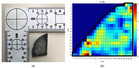 (a) Photograph of the 3% Ga cerium alloy sample used in the mapping analysis and (b) surface Ga concentration map of the sample. The color map represents the localized weight percent of gallium ranging from zero to six percent.
