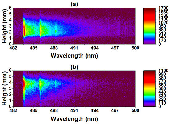 Contour mappings of spatially resolved AlO spectral measurements along the plasma plume height measured at (a) 20 μs and (b) 35 μs time delays.