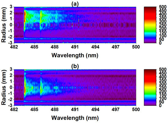 Application of the above procedure was carried out on the emission spectra depicted in the spectral contour mappings presented in Figure 1. The results of the asymmetric Abel inversion are presented in spatial-spectral contour maps in Figure 2. The method by which the Abel inversion of the symmetrized axial profile represented by Equation (2) uses a series expansion of orthogonal polynomials in which series expansion coefficients are determined through minimization techniques [16]. The orthogonal set of polynomials is taken to be Chebyshev polynomials of the first kind. The number of terms to be used in the procedure is 10. This maintains a decent fidelity of the deconvolved profile while avoiding potential oscillatory behavior and noise addition by considering significantly more series terms. The advantage of such a method is it alleviates the need to numerically compute the derivative presented in Equation (1) by way of the series expansion approximation. Such advantages exist in other Abel inversion implementations as well [17]. The Abel inversion is performed through use of a formalized MatLab script [18].